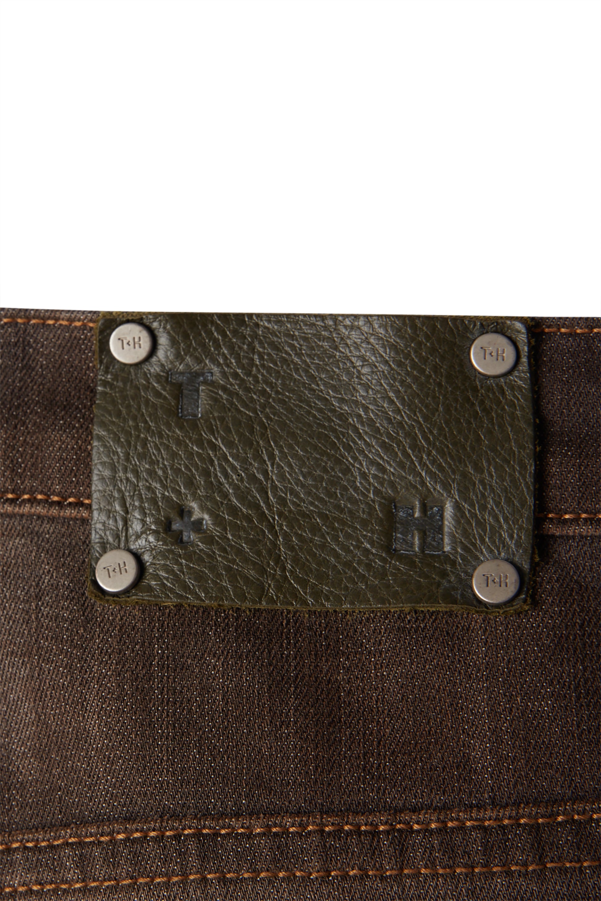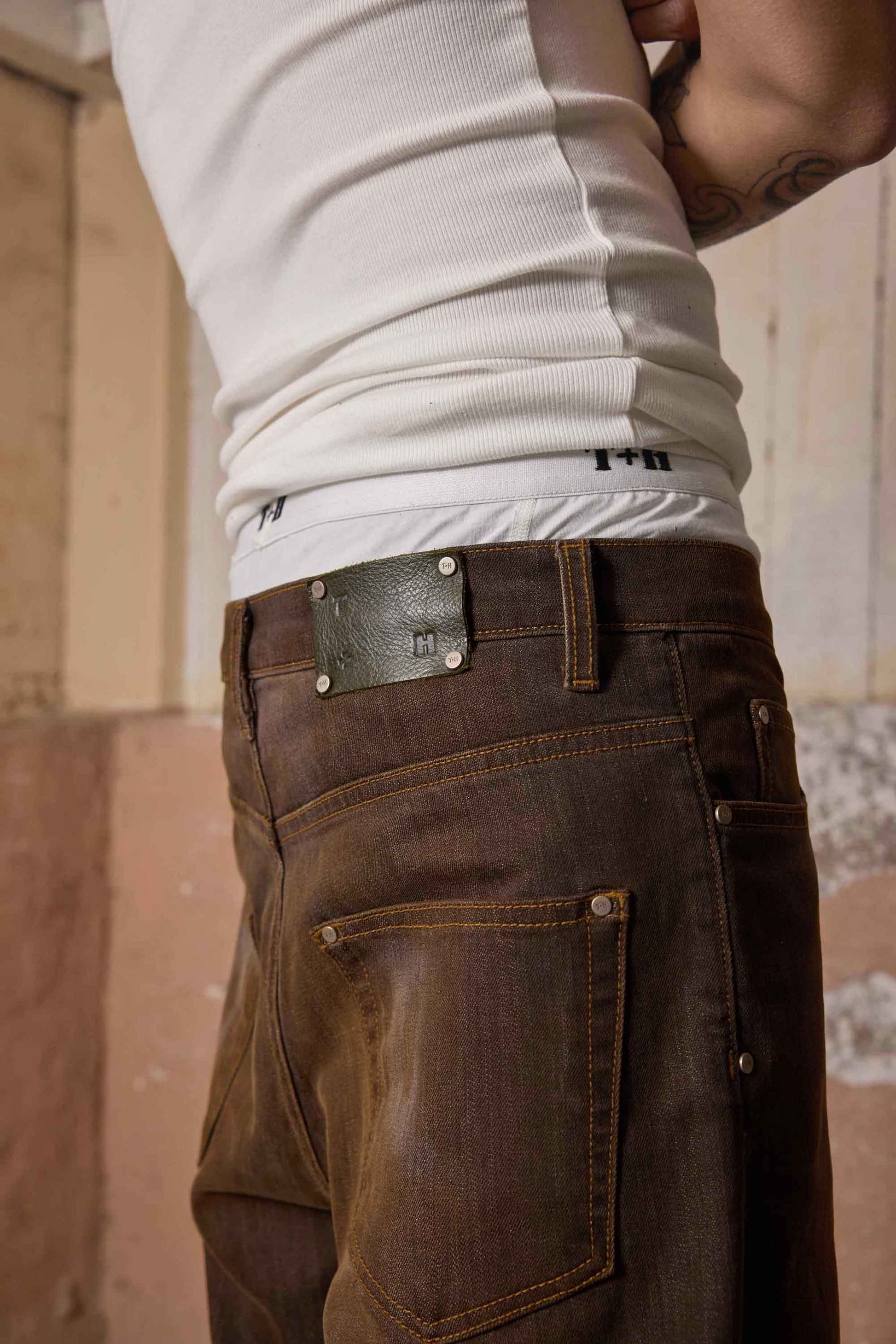 - Branded leather patch at back waistband